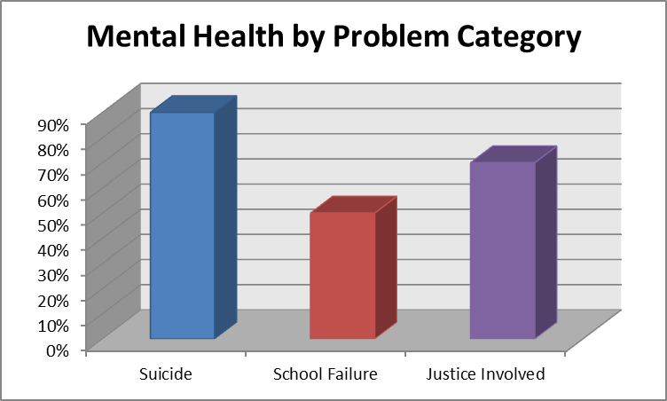 Without treatment, children are much more likely to experience a variety of problems including suicide, school failure and criminal justice involvement.Those who commit suicide (90%), those who fail and drop out of school (50%) and those with criminal justice involvement (70%) are much more likely to suffer from a mental health disorder than others their age (NAMI, 2013)