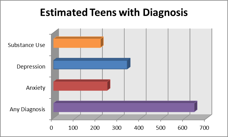 So how are we doing in Okmulgee County when it comes to identification and treatment? With an estimated 3,000 children between age 13 and 17 in Okmulgee County (U.S. Census Data, 2010), we should expect around 650 total diagnoses in any year.